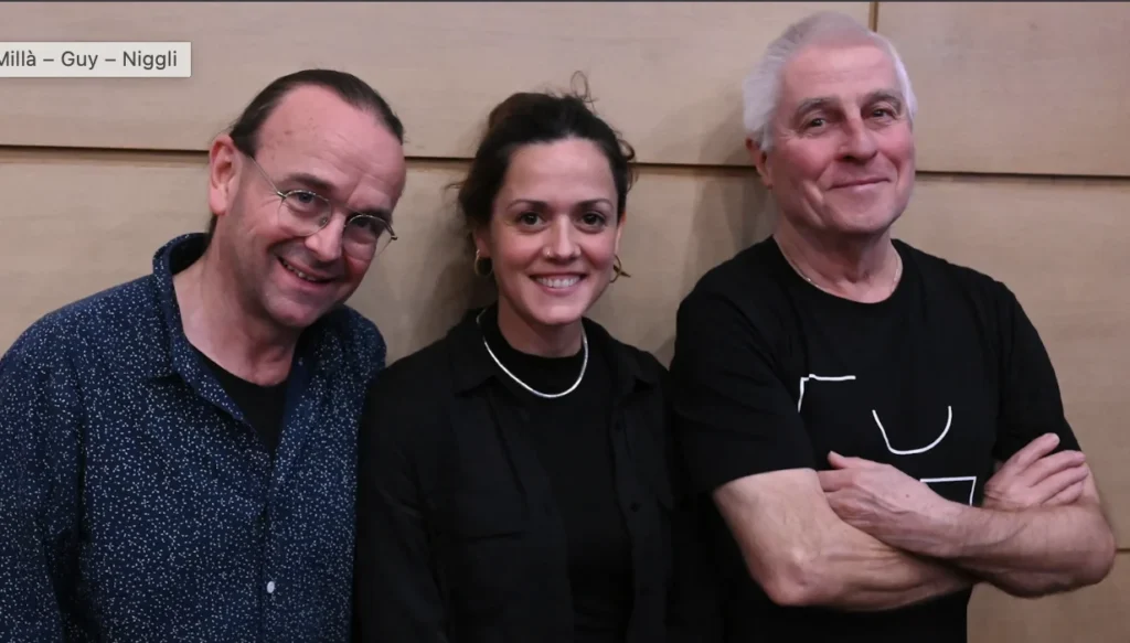 In diesem erst seit 2025 bestehenden Klaviertrio treffen nicht nur drei erfahrene Improvisatoren aufeinander, die allesamt zu den Innovatoren ihres Instrumentalspiels zählen, sondern auch drei Musiker, die als Komponisten im Bereich zeitgenössischer Musik, Performance und aktueller Jazzformen aktiv sind. Das Piano wird nicht von einer Rhythmusgruppe begleitet, die etablierten Rollen werden ständig aufgelöst. Das Ergebnis ist eine äußerst agile und intensive Triomusik, die sich durch ein hohes Maß an formalem Bewusstsein, virtuose Wendungen, wunderschöne Klänge, Witz und eine Disziplin auszeichnet, die den Improvisationen eine besondere Dringlichkeit verleiht. Das gut eingespielte Duo Barry Guy – Lucas Niggli, das bereits auf 25 Jahre Geschichte zurückblicken kann (im Trio Demierre – Guy – Niggli, im Quintett Lucas Niggli BIG ZOOM, im Barry Guy’s London Jazz Composers Orchestra, im Trio mit Maya Homburger und im „HexenTrio“ mit dem legendären kanadischen Pianisten Paul Plimely), wird erneut zu einem Trio erweitert und findet in Jordina Millà eine passende Partnerin für einen Tanz auf dem Drahtseil ohne Netz und doppelten Boden.